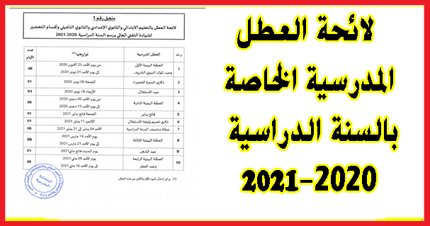لائحة العطل المدرسية الخاصة بالسنة الدراسية 2020 2021