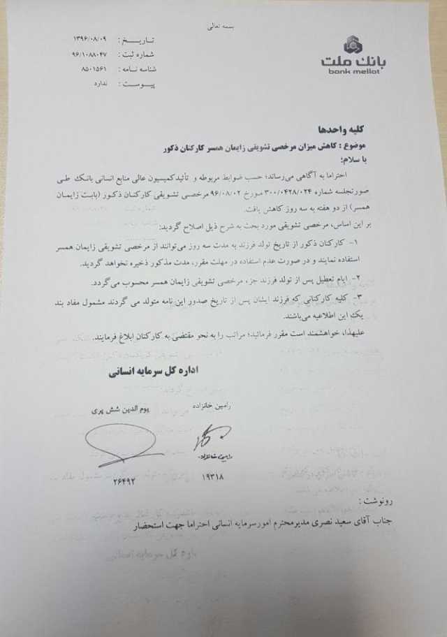 کاهش مرخصی زایمان همسر در بانک ملت تابناک