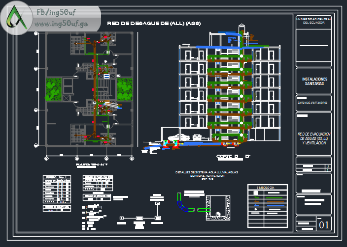 مخطط مشروع عمارة سكنية مع توضيح قنوات الصرف الصحي لها اوتوكاد Dwg